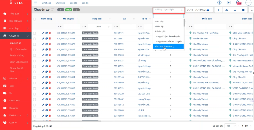 Bước 1: Truy cập màn hình chuyến > Nhấp vào ô “Vui lòng chọn chi phí” > Chọn loại chi phí cần lọc