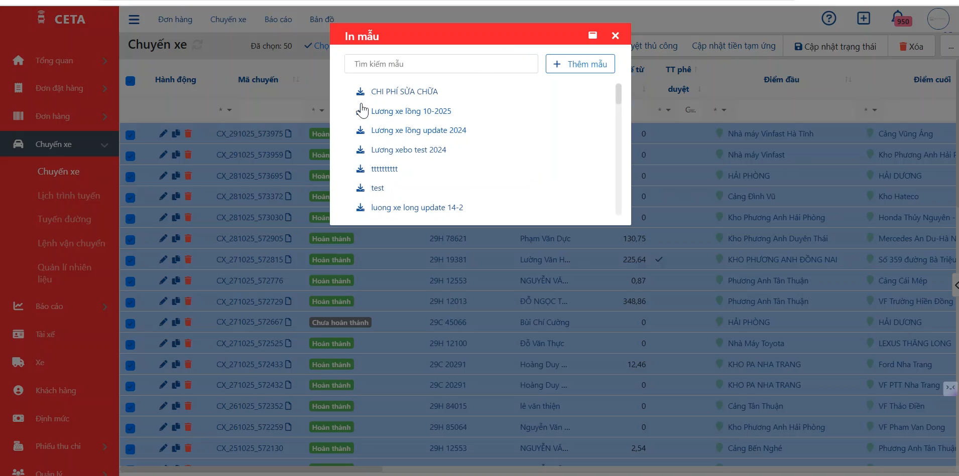 Bước 3: Tích chọn các chuyến cần xuất > Chọn in mẫu > Chọn loại biểu mẫu muốn xuất > file biểu mẫu sẽ được tải về máy hoặc email người xuất