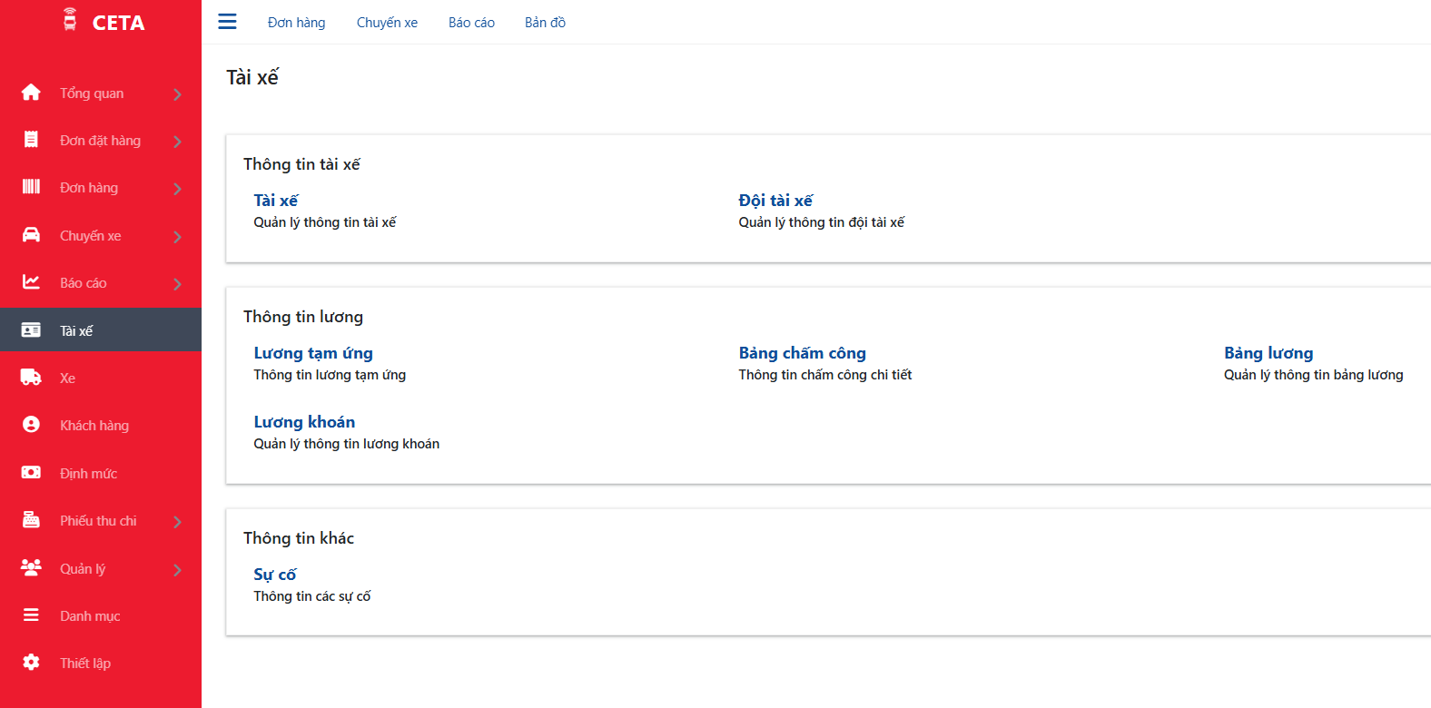 Bước 1: Truy cập hệ thống CETA > Tại mục tài xế chọn “Sự cố”