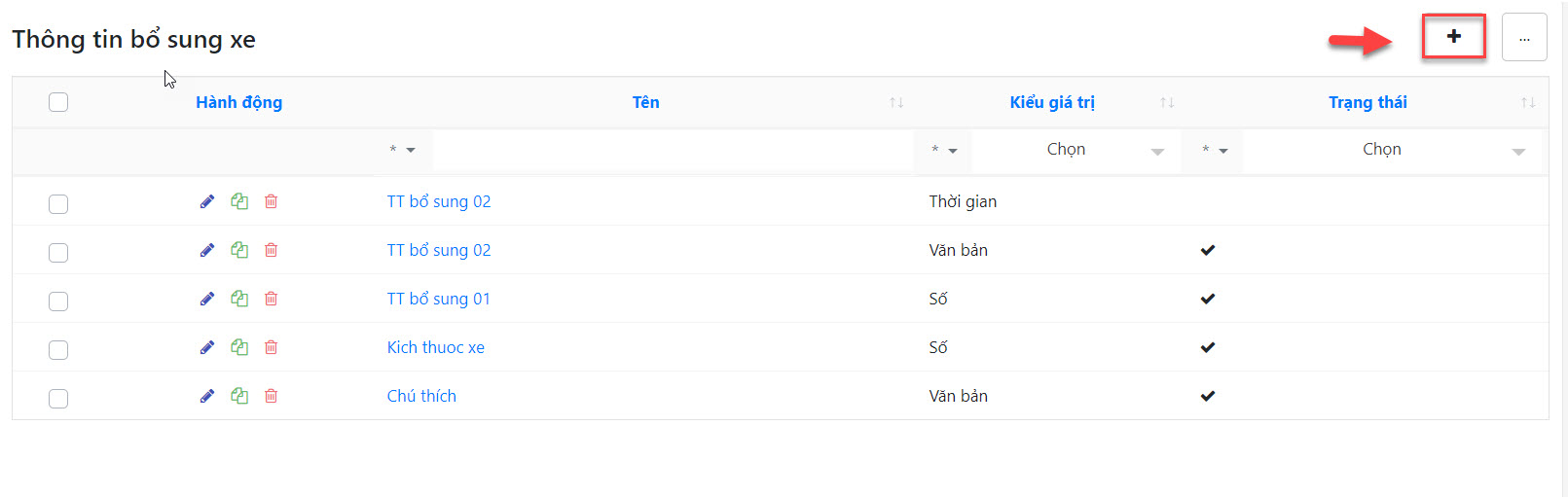 • Bước 2: Tại màn hình danh sách thiết lập thông tin bổ sung xe, bấm vào biểu tượngphía trên góc phải màn hình để thêm mới thông tin bổ sung xe.