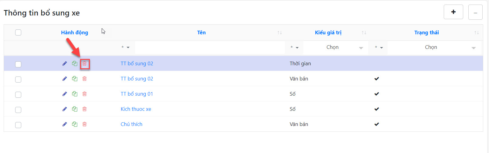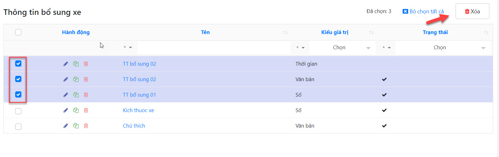 • Cách 2: Xóa hàng loạt thông tin bổ sung xe -> bấm tích chọn vào ô tích tại thông tin bổ sung xe muốn xóa -> bấm vào biểu tượng xuất hiện trên góc phải màn hình -> Xác nhận xóa -> Bấm nút