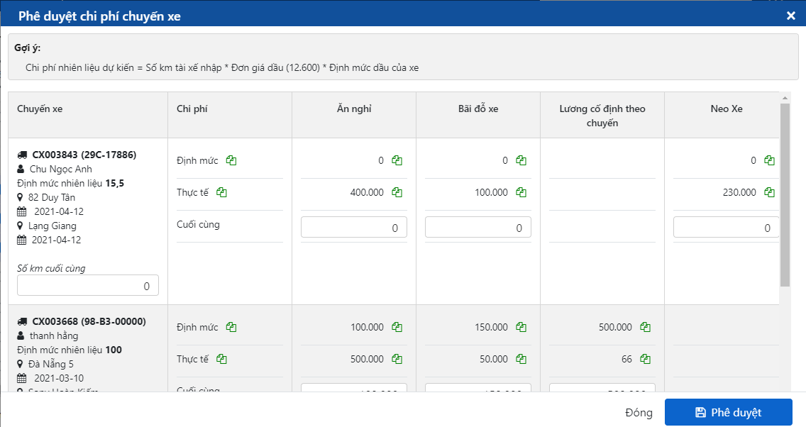 - Phê duyệt thủ công trực tiếp hàng loạt: Cho phép thực hiện phê duyệt cùng một lúc nhiều chuyến xe ngay tại màn hình danh sách chuyến.