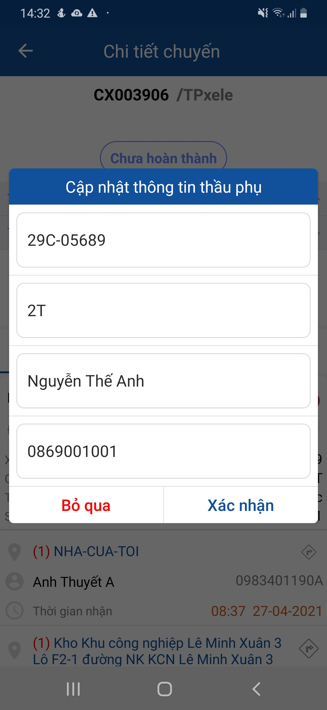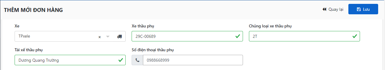 – Đối với tài khoản của tài xế là thầu phụ, khi được phân đơn, có thể bổ sung thêm thông tin về biển số xe, chủng loại xe,Tài xế, số điện thoại của tài xế phụ trách đơn hàng đó.