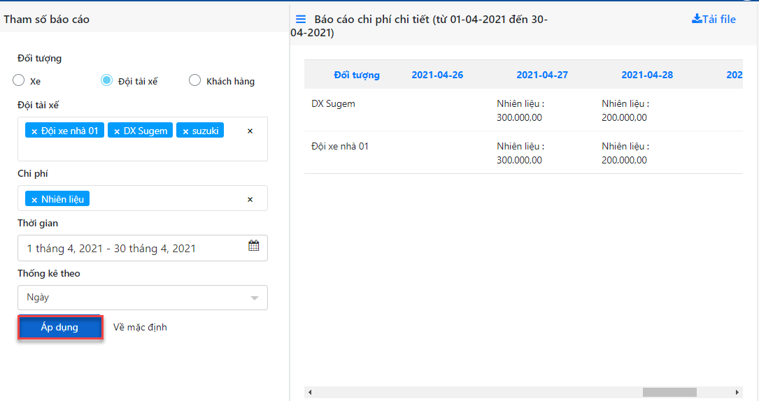 7. Bổ sung mẫu báo cáo chi phí chi tiết: có thể lựa chọn theo dõi theo từng hạng mục chi phí cụ thể theo các đối tượng xe, đội xe, khách hàng trong khoảng thời gian mong muốn. Có thể xuất dữ liệu báo cáo về.