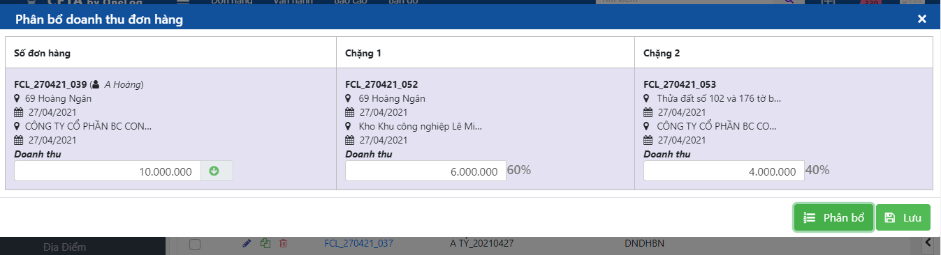 4. Phân bổ doanh thu: Đối với đơn hàng tách chặng, cho phép thiết lập trước phần trăm doanh thu theo từng chặng để khi nhập doanh thu tại đơn hàng tổng, doanh thu tại các chặng sẽ tự động được phân bố theo quy tắc đã thiết lập sẵn.
